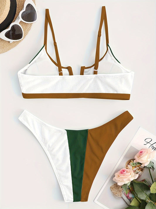 ZAFUL Contrast Color Rib-Knit 2 Piece Set Bikini, V Neck High Cut Sexy Swimsuits, Women's Swimwear & Clothing