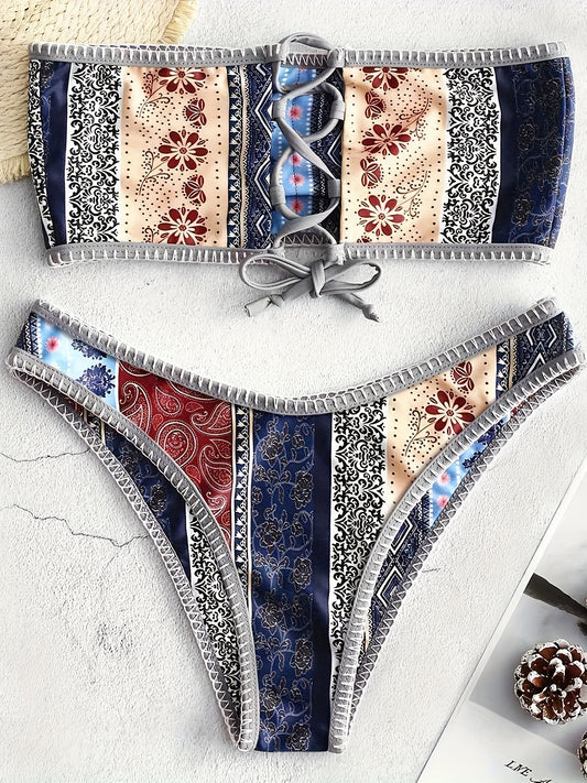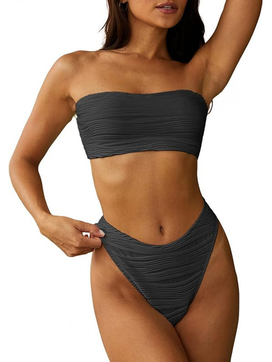ZAFUL Women Strapless Wave Bandeau Bikini 2pcs Swimwear Cheeky Solid Lace Up Bathing Suits