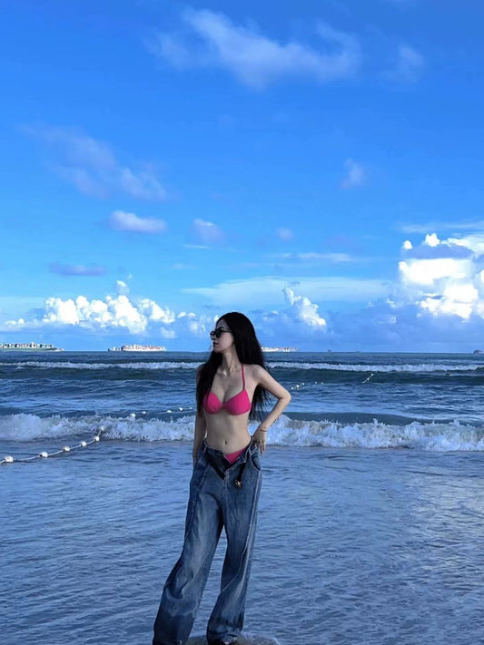 Rose Red Separates Vacation Style Seaside Girl Bikini