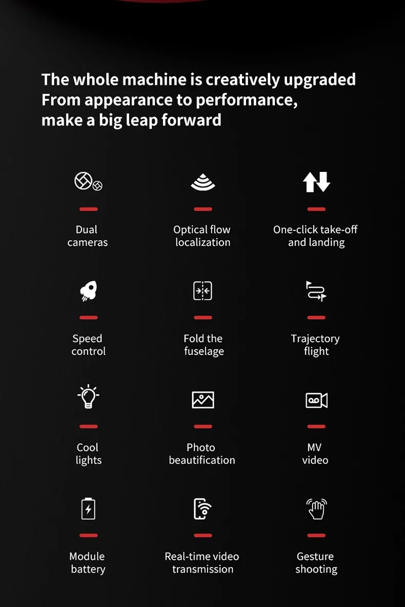 Function: Up/Down/Front/Rear/Left/Right Turning, Lateral Flight, LED Light, Headless Mode, One Click Automatic Return, Height Maintenance Mode, WiFi FPV (Dual Lens with Dual Lens Switching Function)"