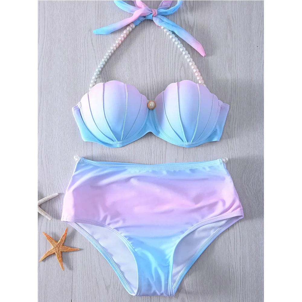 Lady inspired design summer beachwear swimwear underwired bra cup push up pearls shell high waist bikini set